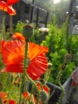 poppies, Mexican sunflowers, fennel, and asparagus self-seeding into