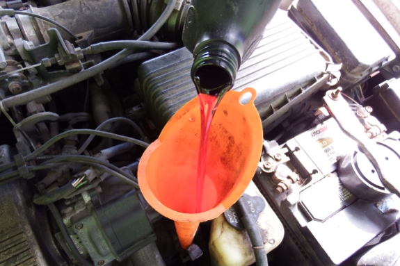 Pouring transmission fluid into a funnel going into the dip stick hole.
