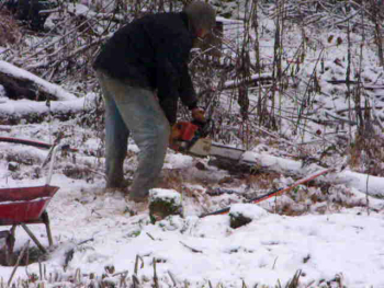 the chainsaw's gas having somehow frozen solid so that we couldn't cut