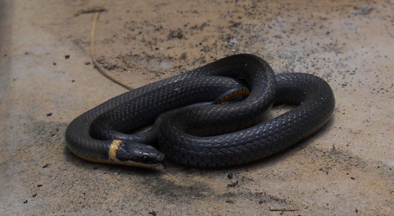 On the other hand, I learned that I'm going to have to stop telling people that we only have two poisonous snakes in our area. Wikipedia informed me: "[Ring-necked snakes] are slightly venomous but their non-aggressive nature and small rear-facing fangs pose little threat to humans who wish to handle them." (They use their venom to subdue their prey of salamanders, worms, and slugs to make them easier to swallow.)