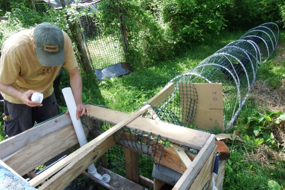 The wheelchair chicken tractor PVC feeder can hold half a gallon of laying pellets.