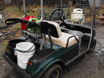 pushed the cart along with one foot --- kinda like in the Flintstones