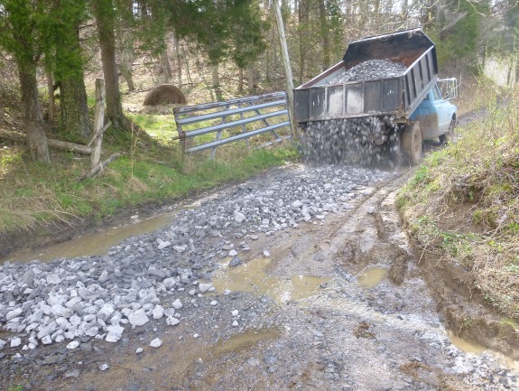 Someone commented above about how the road was the lowest point and often got waterlogged. The only true solution to this, short of raising and banking the road surface is to install a drainage system on the sides. This will ensure the water does not form ponds. On the other hand, the rocks should partially solve the water logging issue as I am assuming they will be smoothed out so that the surface is even.