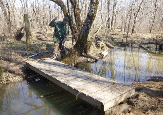 A short section of nylon rope should keep our foot bridge from floating too far during the next big flood.