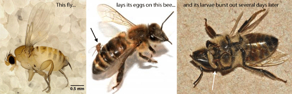 tiny parasitic fly lays its eggs on honeybees, then the larvae nibble