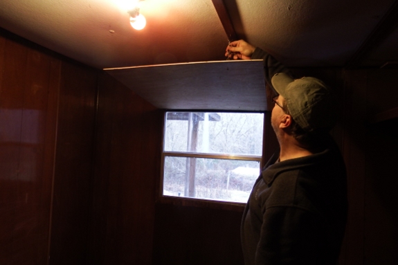 A thin sheet of plywood on two hinges makes a good plywood curtain.