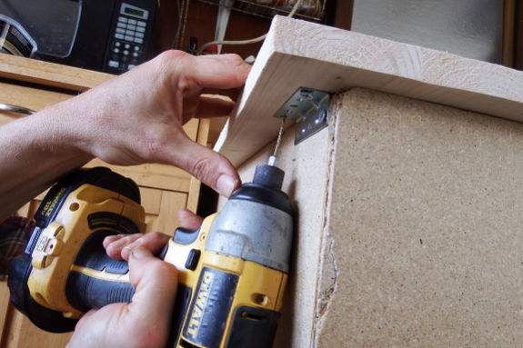 Before heading to Lowes, we measured the newly opened space, figuring we'd move one of our rolling islands in to fill part of the area. Mark took off the towel rod and hinged counter-extender, then the island fit perfectly as-is.